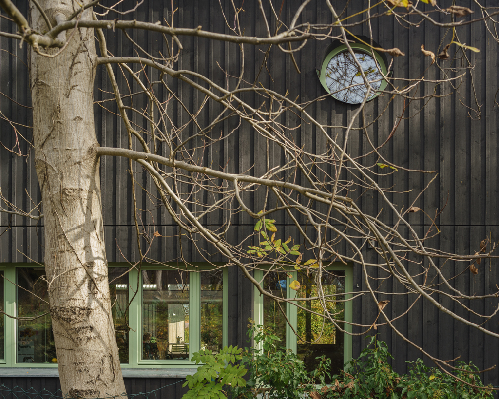 Das «Lange Haus» dehnt sich entlang der östlichen Parzellengrenze in Nord-Süd Richtung und bildet ein klares Vis-a-Vis, einen Rücken zur Siedlung Kalchbühl. Das «Punkt Haus» steht leicht ausgedreht im Garten und schafft in der konischen Grundstücksfläche gut proportionierte Aussenräume. Die Ausrichtung des Gebäudes orientiert sich an der natürlichen Topographie. Der «Gartenhof» ist das Herzstück der Genossenschaft. Er ist der Ort des informellen Aufeinandertreffens, des gemeinsamen Spiels und des kollektiven Aufenthalts. Er verbindet die Genossenschaftssiedlung, vermag aber mit dem imposanten Baumbestand und der fassbaren Grösse auch als intimer Garten zu wirken. Die Adressen beider Gebäude liegen konsequent an der Kalchbühlstrasse, wobei das kleinere Haus über einen grosszügigen Durchgang erschlossen wird und sich so anbindet.