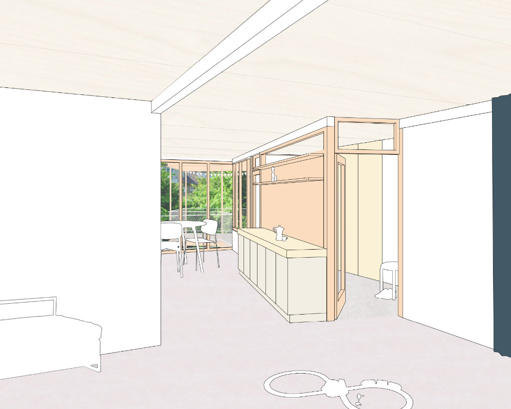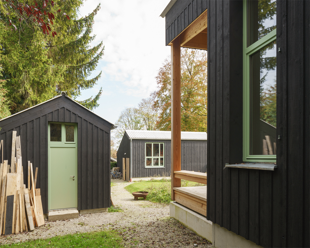 Ein Gebäudeensemble bestehend aus Hauptgebäude, Remise und Heizhaus bietet vielfältig nutzbare Räume für Wohnen und Werken an. Durch die Setzung der Gebäude, wird der Freiraum in einen zentralen Gartenhof sowie vier „Gartenzimmer“ mit unterschiedlichen Qualitäten gegliedert. Je nach Tages- und Jahreszeit wird der bewohnte, räumlich definierte Lebensraum somit erweitert. Viel Wert wird auf eine Verschränkung der Außen- und Innenräume gelegt, z.B. durch die nach Osten ausgerichtete, tiefe Veranda des Hauptgebäudes. Alle Innenräume des Hauptgebäudes erhalten somit im Erdgeschoß wie auch im Obergeschoß eine direkte Erweiterung im überdachten Außenraum. Die zusätzliche Nutzbarkeit der Veranda als außenliegende Erschließungsschicht ermöglicht bei Bedarf die freie Unterteilung des inneren Raumangebotes in mehrere Einheiten. Das Hauptgebäudes ist als Holzskelettbauweise konstruiert. Diese ist im Bereich der Außenwände zur Veranda hin mit Verglasung oder einer Ausfachung aus massiven Holzbohlen gefüllt. Die Ausfachung der Tragstruktur im Innenraum erfolgt je nach Notwendigkeit eines räumlichen Abschlusses mehr oder weniger offen. Im Inneren ergeben sich somit unterschiedliche Bezüge zwischen den einzelnen Raumsegmenten. Eine Anpassung je nach Lebensphase von einer gekammerten Raumfolge in einen großen strukturierten Raum ist mit sehr einfachen Massnahmen umsetzbar. Das Hauptgebäude ist eine robuste Raumstruktur, in die jederzeit weitere kleinere Gefäße wie Zimmer, Raumnischen, Schränke, Regale oder Küchenelemente hineingebaut oder hineingestellt werden können.