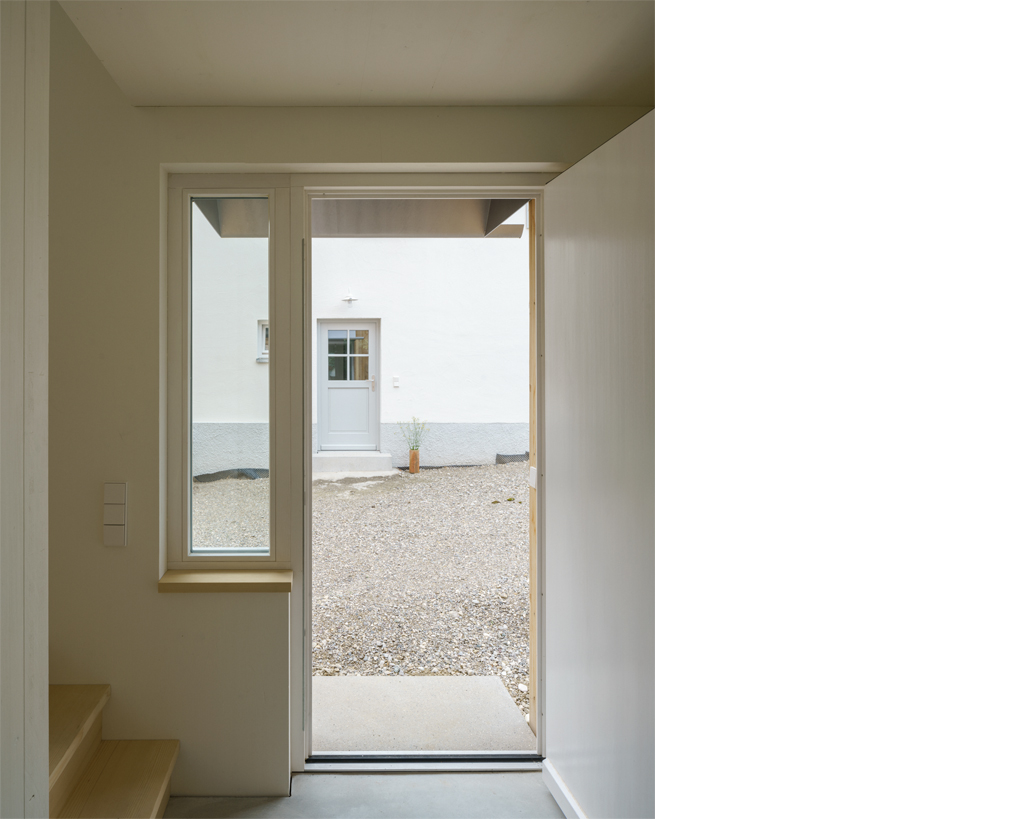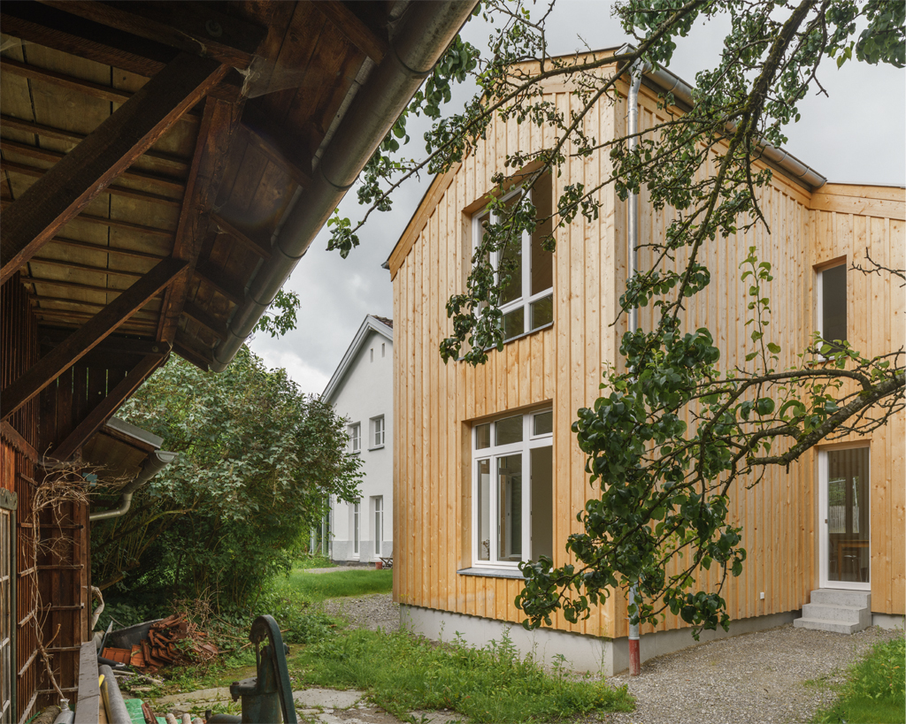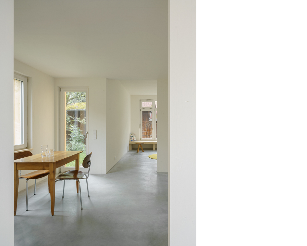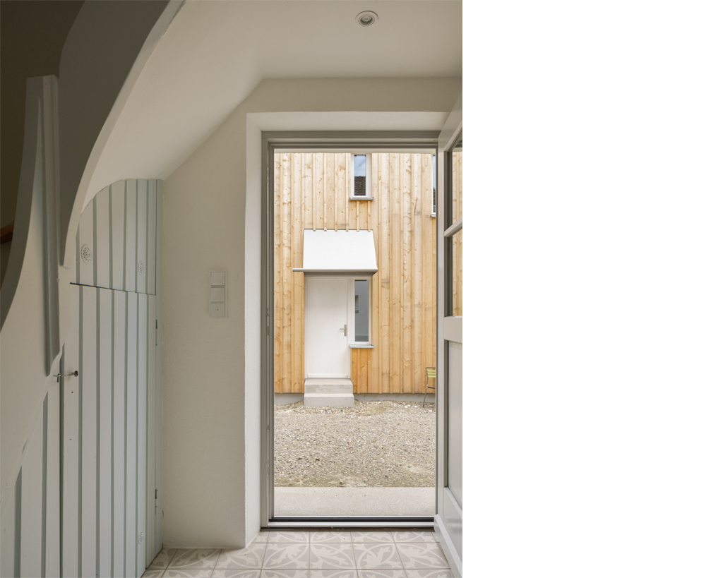 Als zentrale räumliche Idee bildet der Bestand mit dem neuen Wohnhaus einen gemeinsamen Erschliessungshof, der zum gemeinschaftlichen Zentrum der beiden Wohneinheiten wird. Beide Wohnhäuser verfügen im Erdgeschoss zudem über seitlich angeordnete Fenstertüren, die auf der Hof abgewandten Seite den privaten Gartenbereich des jeweiligen Hauses erschliessen. Beim Neubau ist durch das Gegenüber der alten Remise, unter deren schützendem Vordach sich der Gartensitzplatz befindet, auch der private Garten räumlich gefasst, von dem aus der Blick zurückfällt auf die drei Stufen hoch zur Küche.