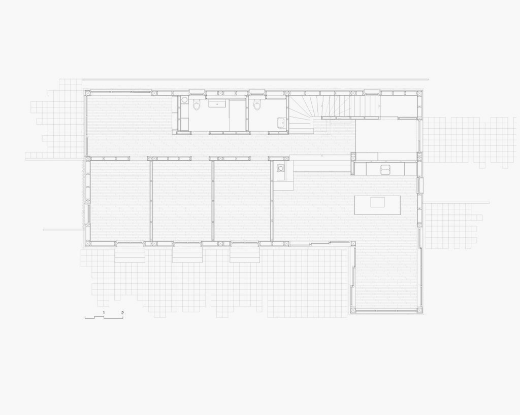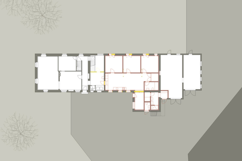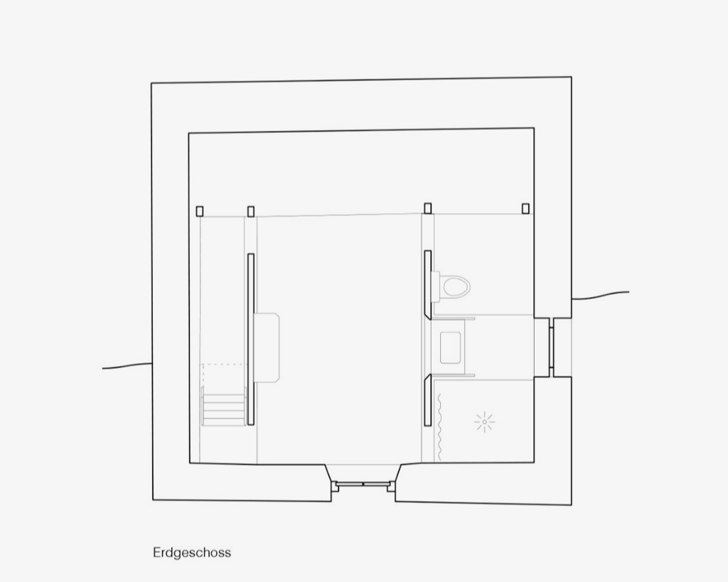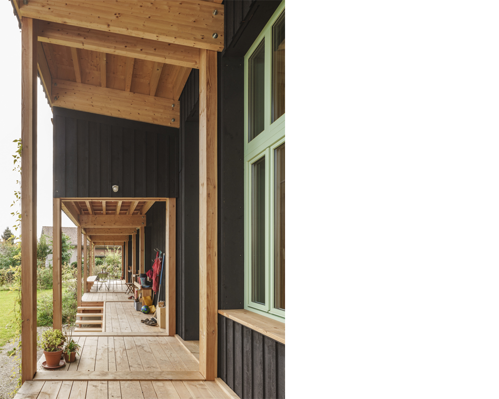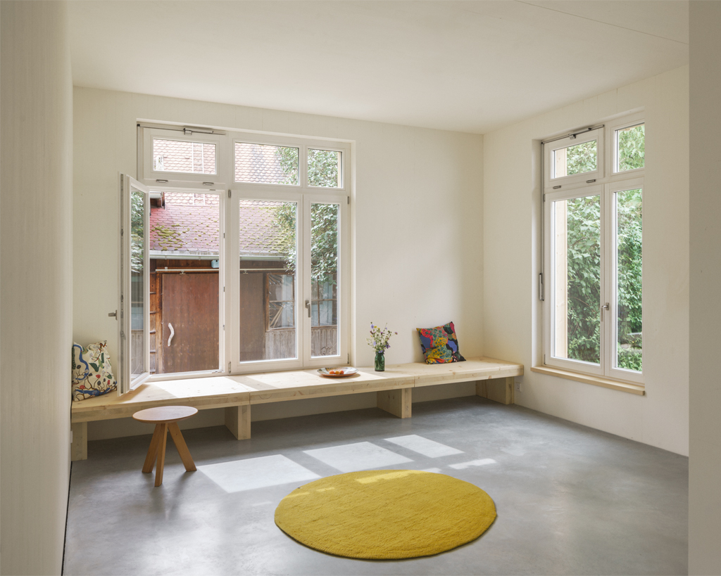 Als zentrale räumliche Idee bildet der Bestand mit dem neuen Wohnhaus einen gemeinsamen Erschliessungshof, der zum gemeinschaftlichen Zentrum der beiden Wohneinheiten wird. Beide Wohnhäuser verfügen im Erdgeschoss zudem über seitlich angeordnete Fenstertüren, die auf der Hof abgewandten Seite den privaten Gartenbereich des jeweiligen Hauses erschliessen. Beim Neubau ist durch das Gegenüber der alten Remise, unter deren schützendem Vordach sich der Gartensitzplatz befindet, auch der private Garten räumlich gefasst, von dem aus der Blick zurückfällt auf die drei Stufen hoch zur Küche.