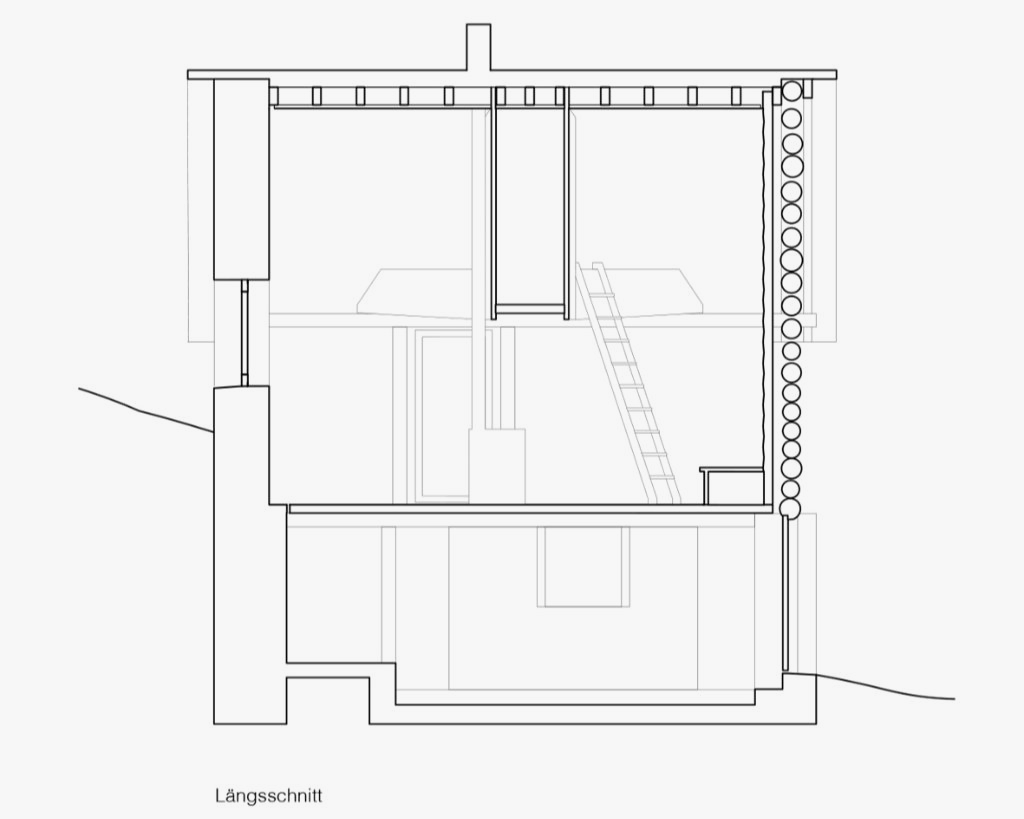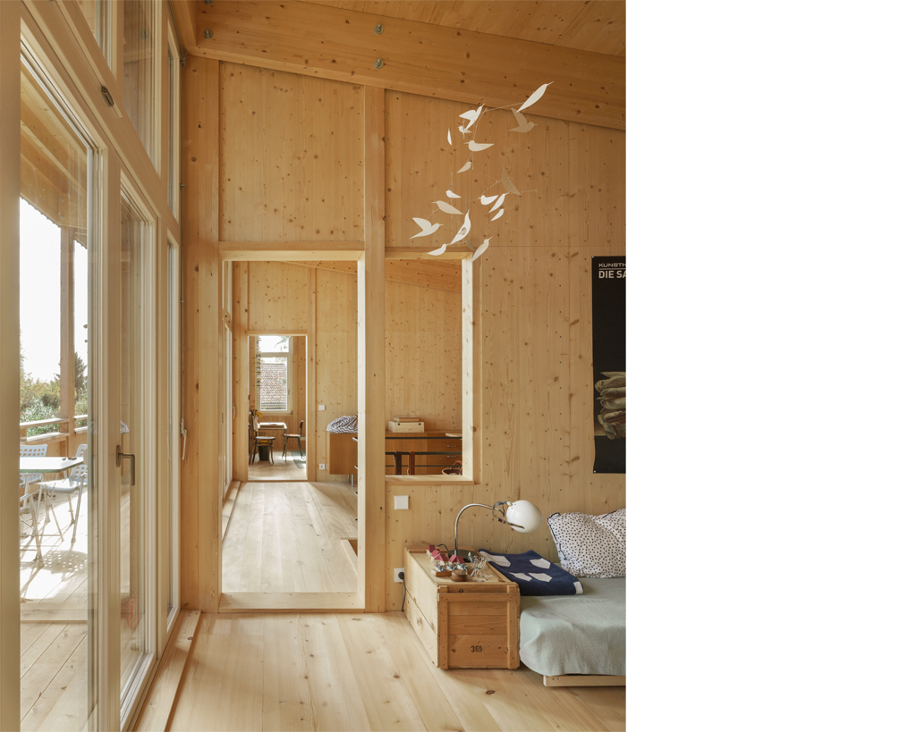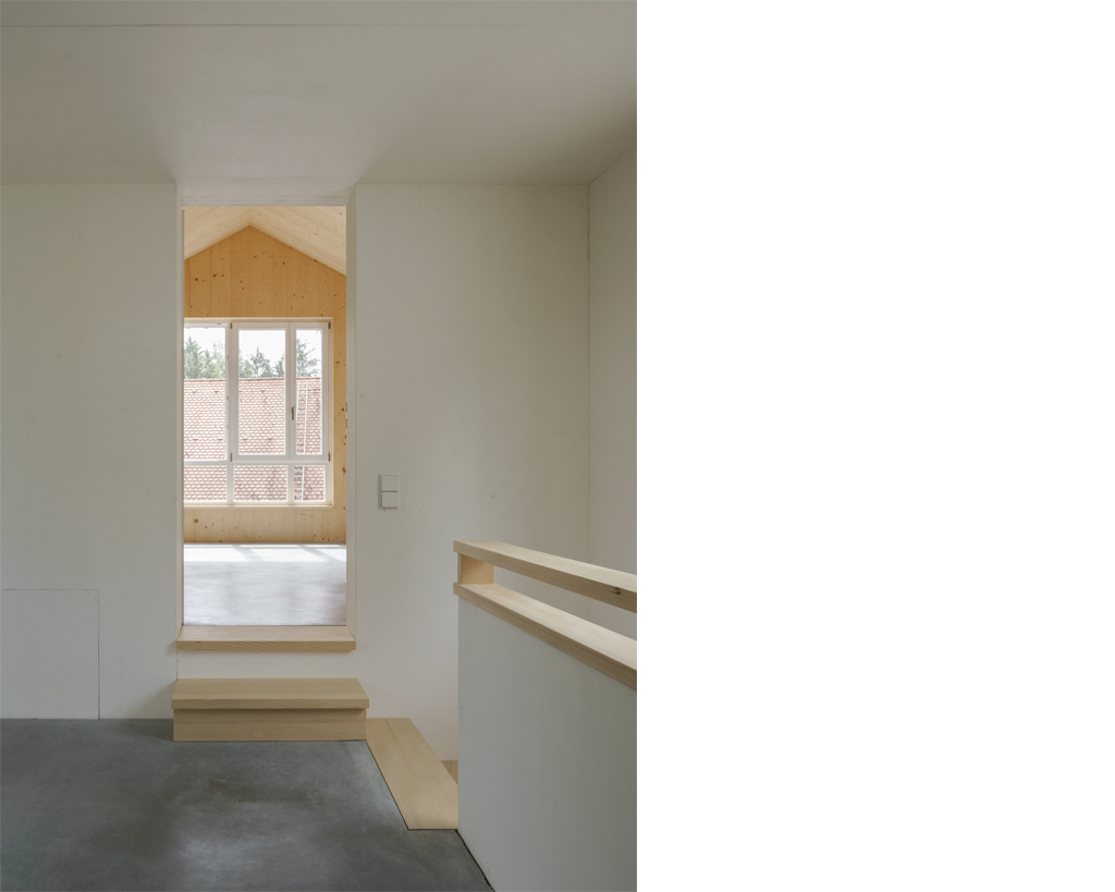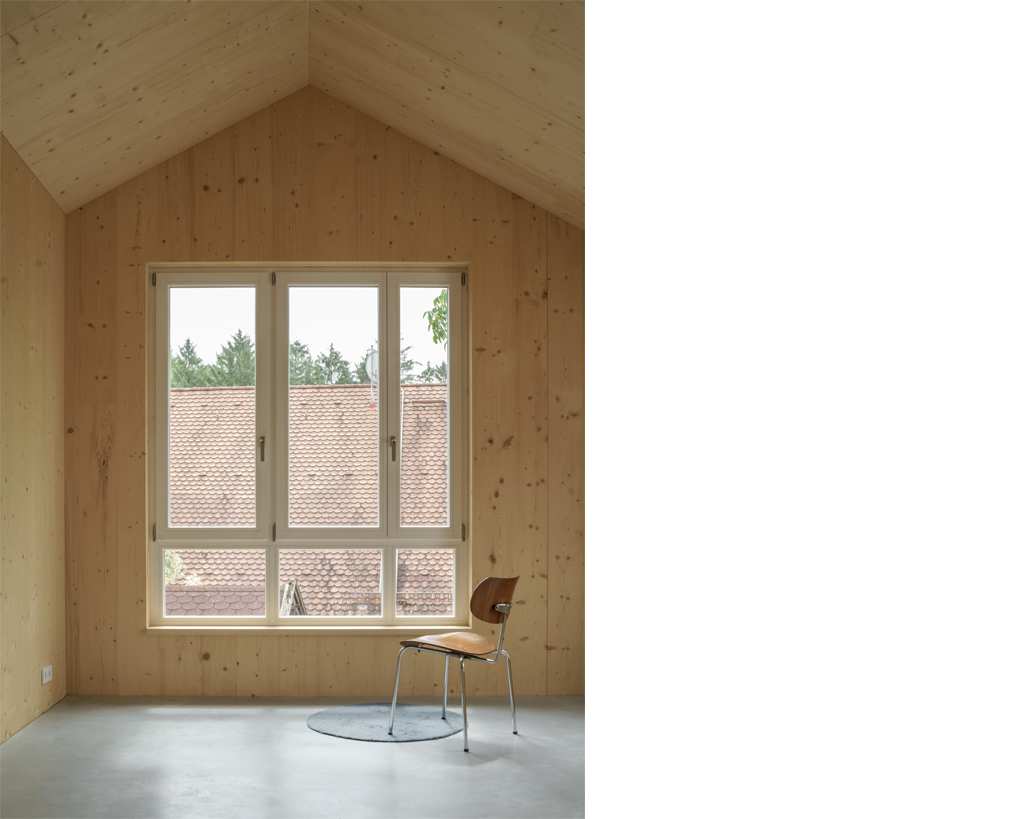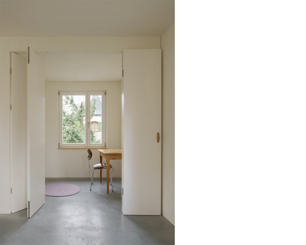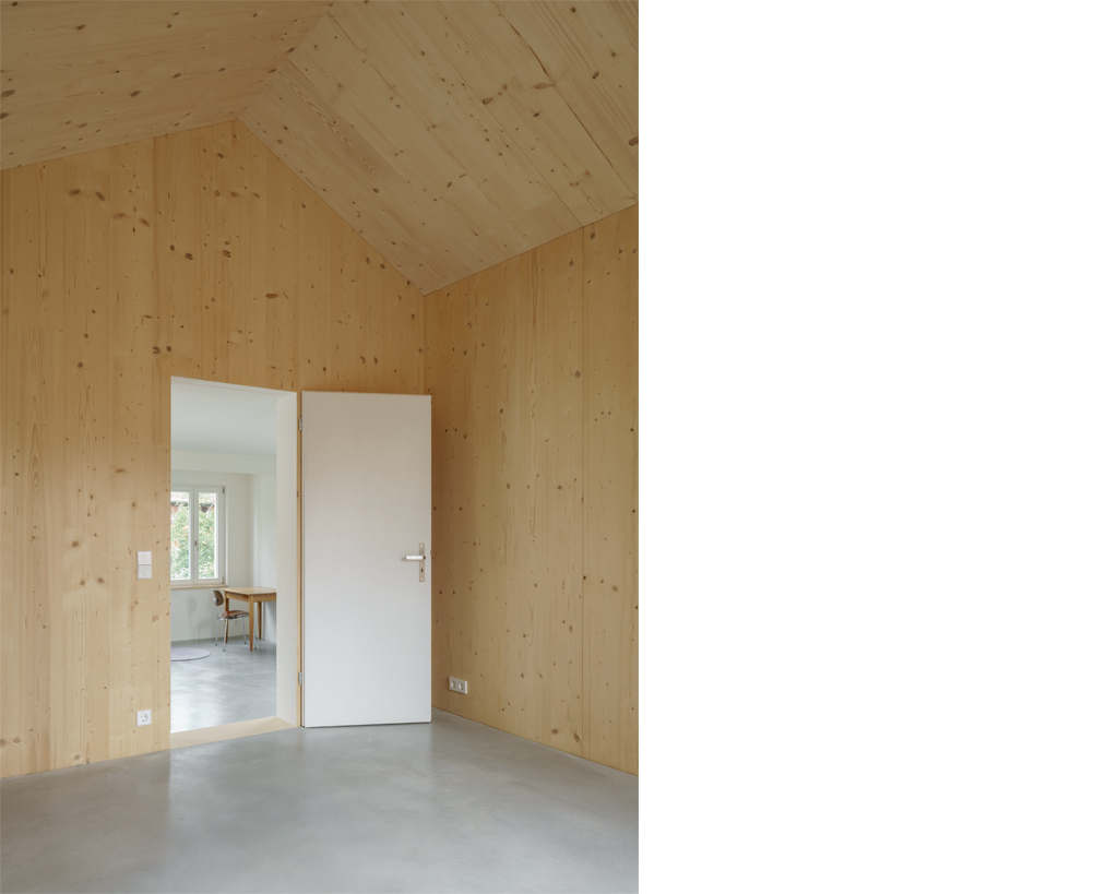 Der Neubau ist mit seinen 70qm Wohnfläche auf zwei Geschossen sehr kompakt. Gleichzeitig schafft sein räumliches Konzept ein sehr grosszügiges Raumgefühl, das an bestimmten Situationen gezielt mit dem Aussenraum Synergien aufbaut und seinen Fokus auf Innenräume legt, die sowohl alleine, als auch als Teil einer zusammenhängenden Raumabfolge genutzt werden können. Im Obergeschoss entsteht eine starke Kontrastwirkung durch die Gegenüberstellung von einem Kleinstraum und dem grössten Zimmer, vom Raumschnitt her gesehen einem Haus im Haus. Je nach Nutzungsbedarf kann die dazwischengeschaltete Wohndiele verkleinert und ein weiteres, zusätzliches Zimmer abgetrennt werden, so dass eine vierköpfige Familie das Haus bewohnen kann.