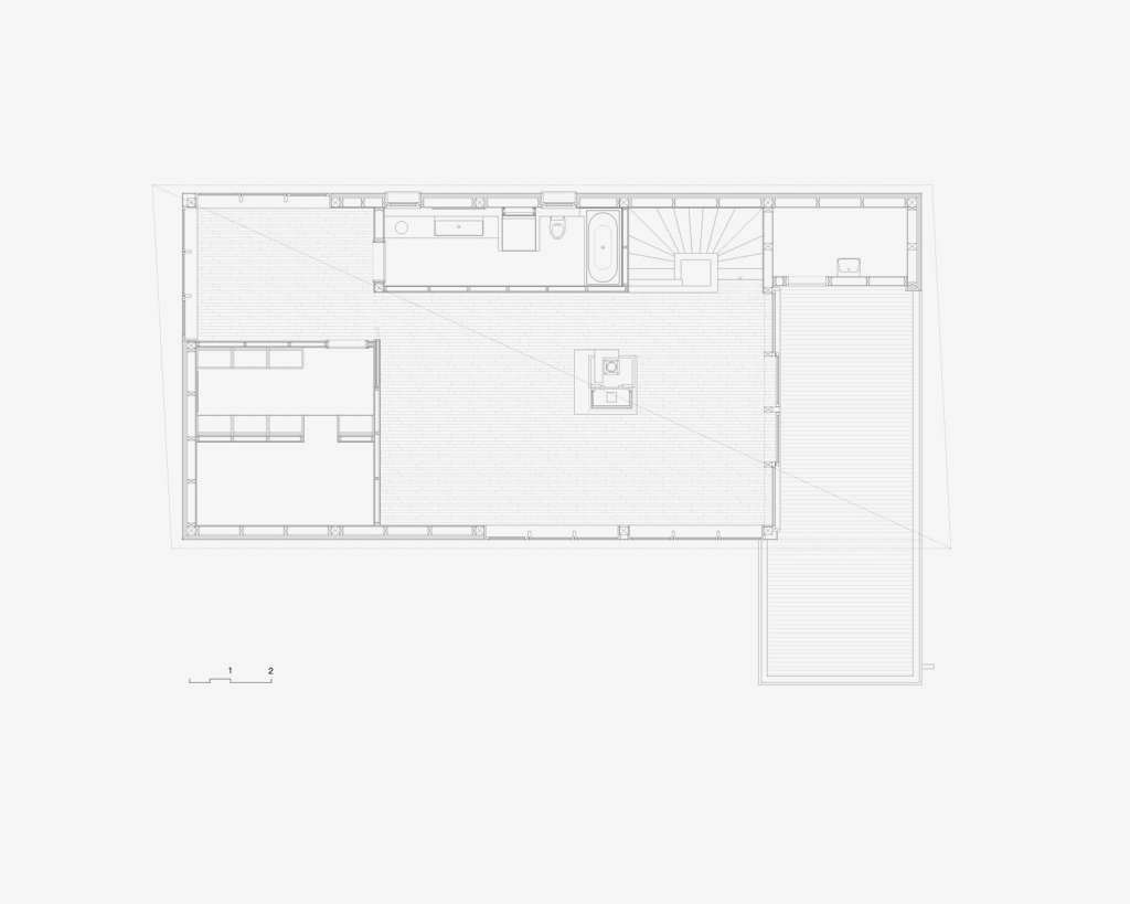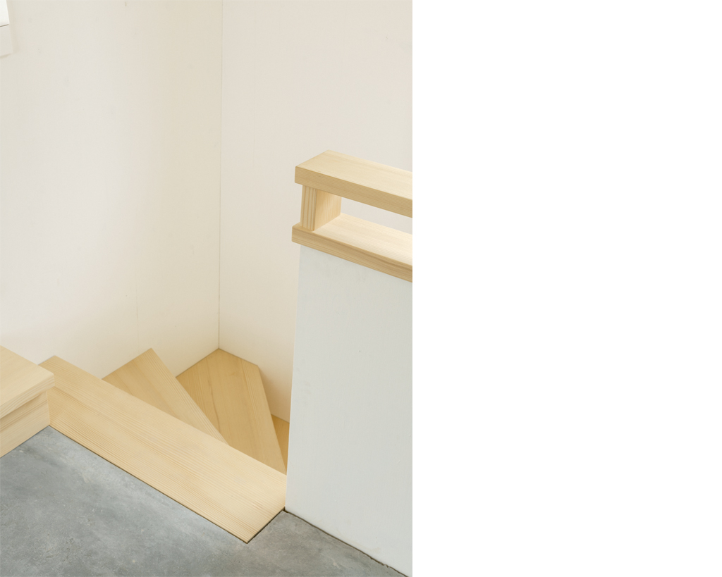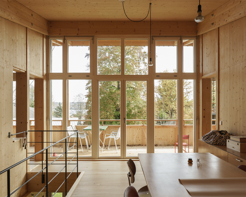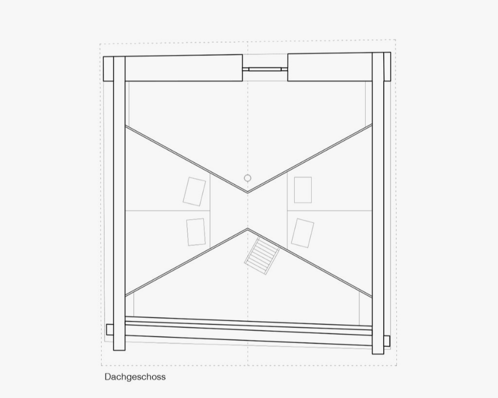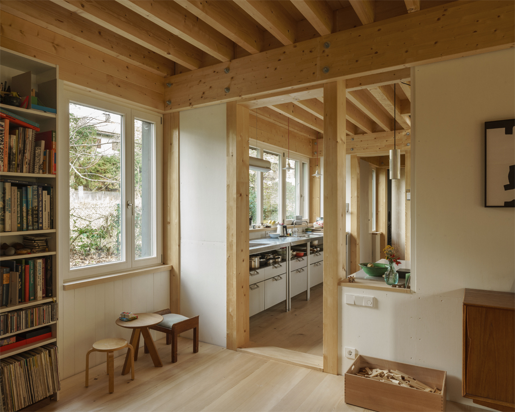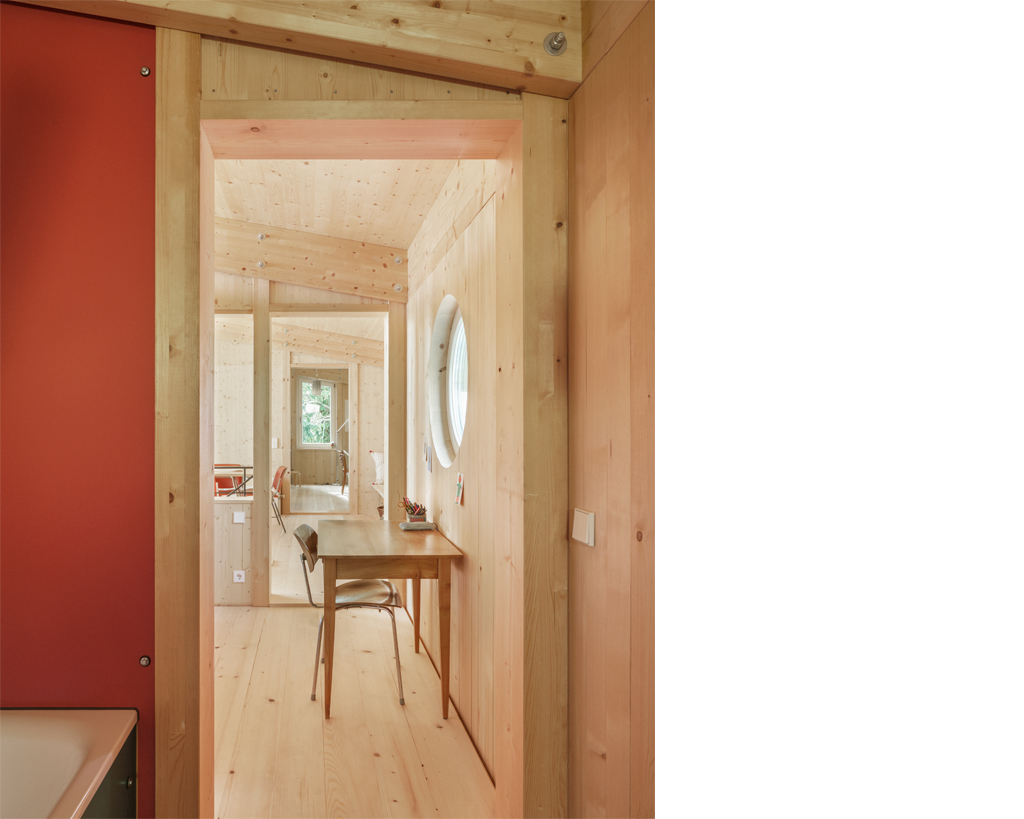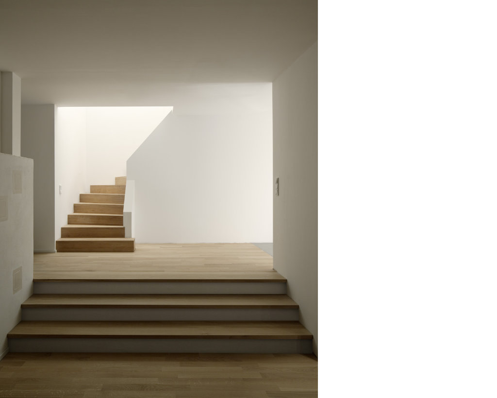 Der Neubau ist mit seinen 70qm Wohnfläche auf zwei Geschossen sehr kompakt. Gleichzeitig schafft sein räumliches Konzept ein sehr grosszügiges Raumgefühl, das an bestimmten Situationen gezielt mit dem Aussenraum Synergien aufbaut und seinen Fokus auf Innenräume legt, die sowohl alleine, als auch als Teil einer zusammenhängenden Raumabfolge genutzt werden können. Im Obergeschoss entsteht eine starke Kontrastwirkung durch die Gegenüberstellung von einem Kleinstraum und dem grössten Zimmer, vom Raumschnitt her gesehen einem Haus im Haus. Je nach Nutzungsbedarf kann die dazwischengeschaltete Wohndiele verkleinert und ein weiteres, zusätzliches Zimmer abgetrennt werden, so dass eine vierköpfige Familie das Haus bewohnen kann.