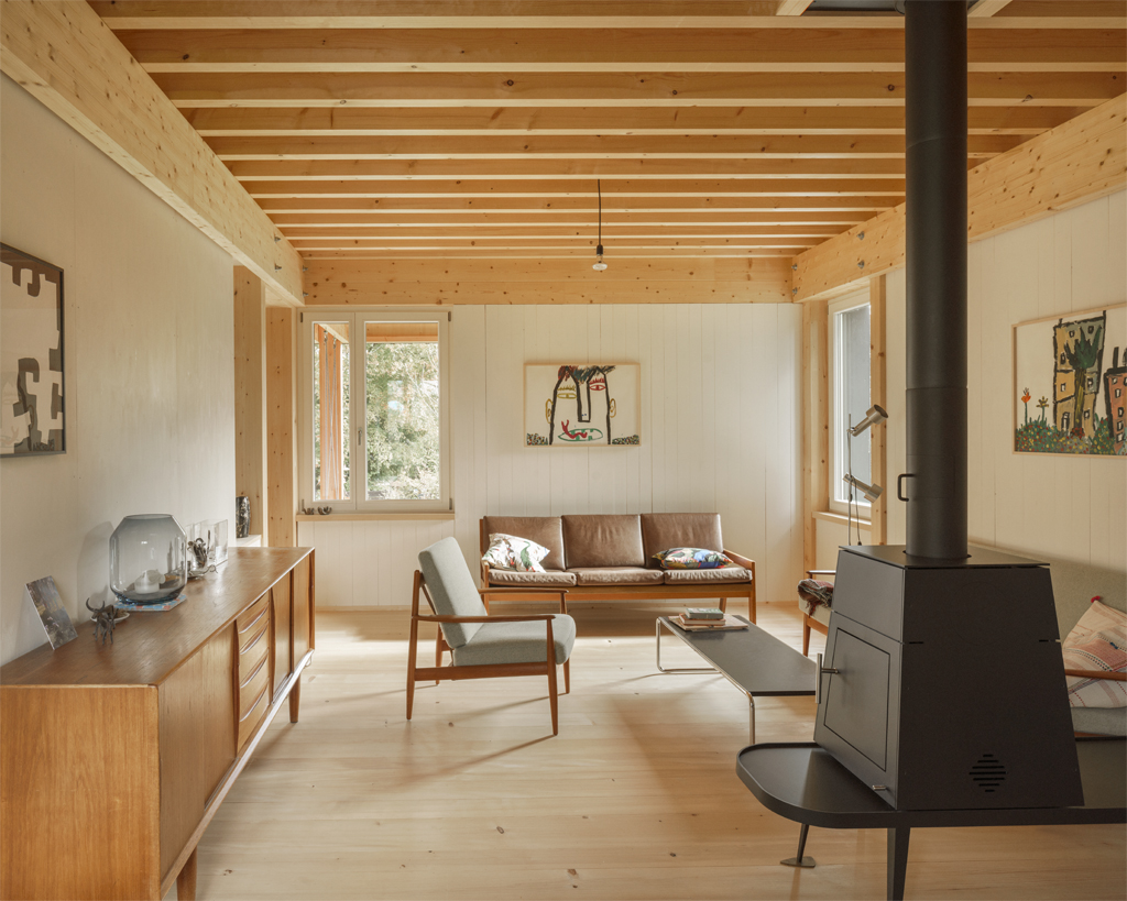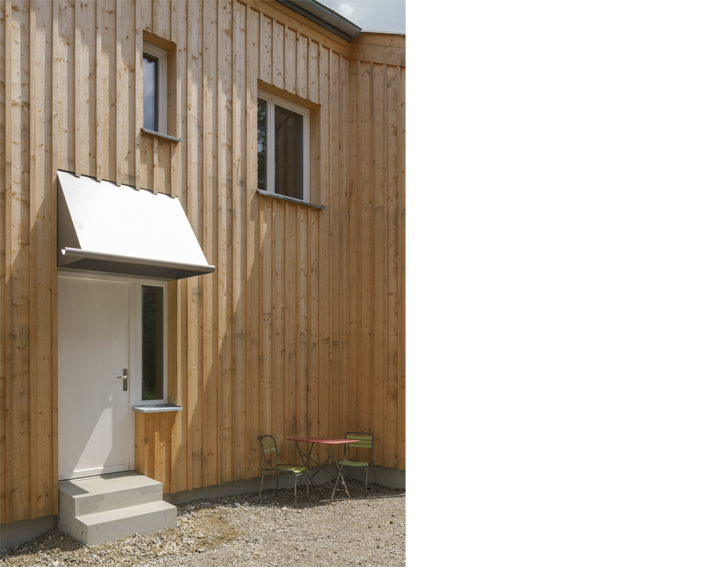 Das Gebäude ist als Holzbau mit einer 120mm massiven, inneren tragenden Schicht entworfen, die nur noch mit einer Leinölfarbe gestrichen die fertige innere Oberfläche bildet. In Kombination mit einem steinernen Sichtestrich, weiss gestrichenen Holzfenstern und einer naturbelassenen äusseren Holzschalung aus der örtlichen Sägerei, einer Dämmung aus Glasschaum oder Holzfasern, sowie einem Vordachhut aus massivem Stahl in der Art einer übergrossen Leuchte, prägen ausnahmslos natürliche Materialien nicht nur die Oberflächen, sondern auch die Tiefe der Konstruktion.