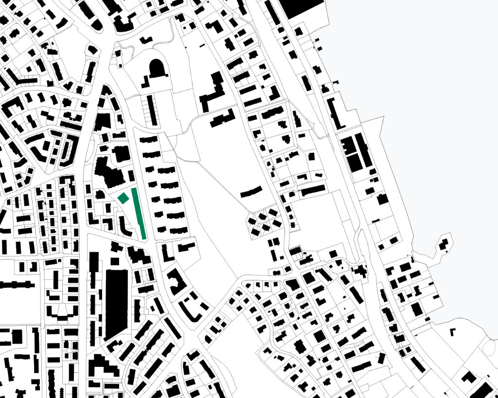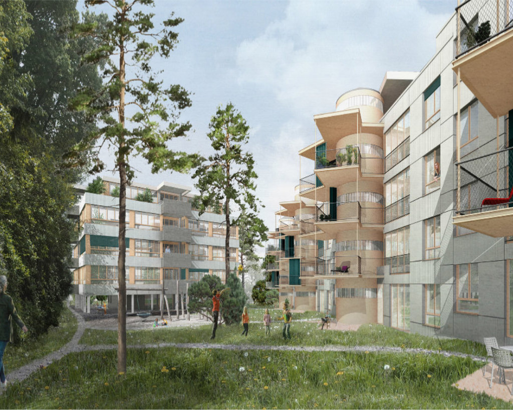 Das Grundstück ist geprägt durch die von Süd nach Nord abfallende Topographie, die zusammen mit der Baumkulisse dem Ort eine spezifische Eigenart verleiht. Im Kontrast dazu steht der schnurgerade Verlauf der östlichen Parzellengrenze. Die zwei neuen Häuser fassen einen klaren Strassenraum entlang der Kalchbühlstrasse und schaffen einen attraktiven, genossenschaftlichen «Gartenhof». Die zwei viergeschossigen Gebäude, das strassenbegleitende «Lange Haus» und das zurückversetzte «Punkt Haus» orientieren sich an der gebauten und gewachsenen Struktur der Umgebung und stärken die bestehenden Qualitäten.