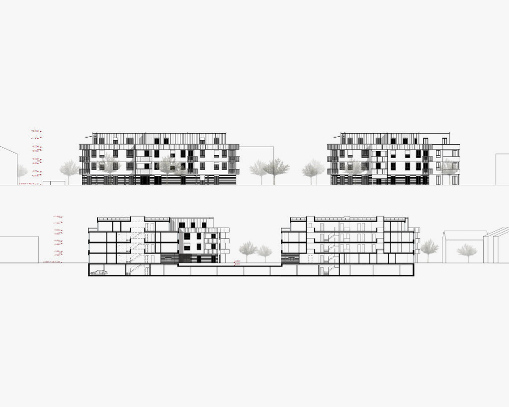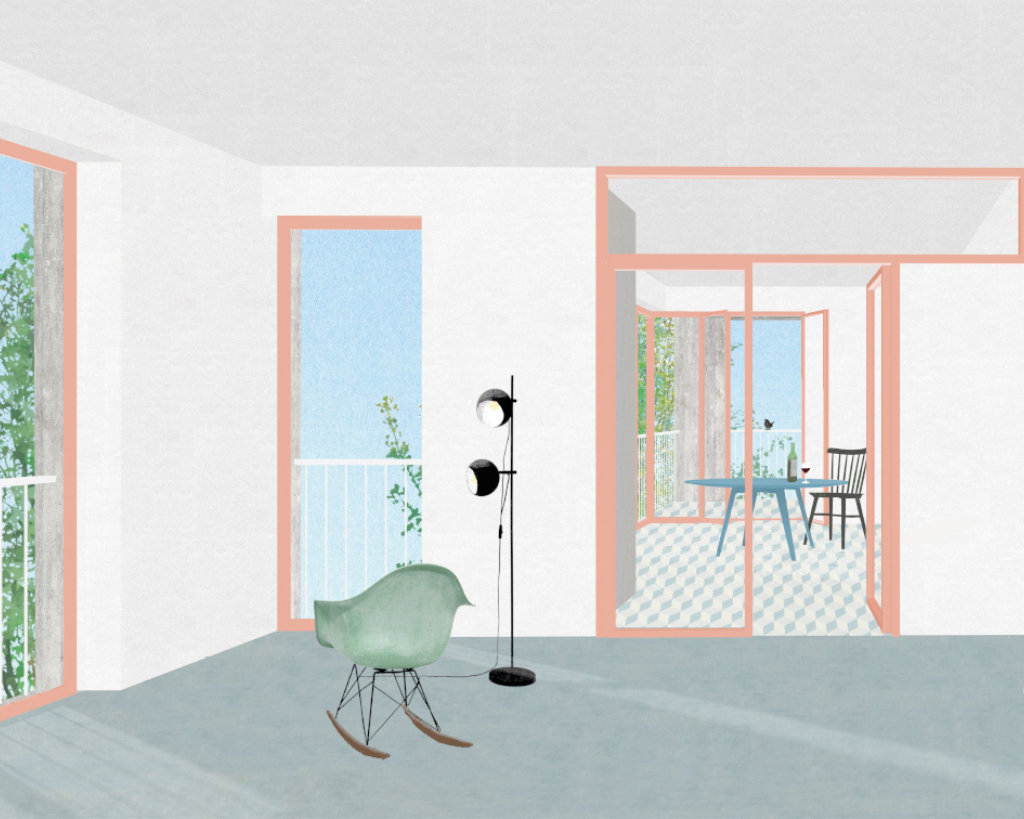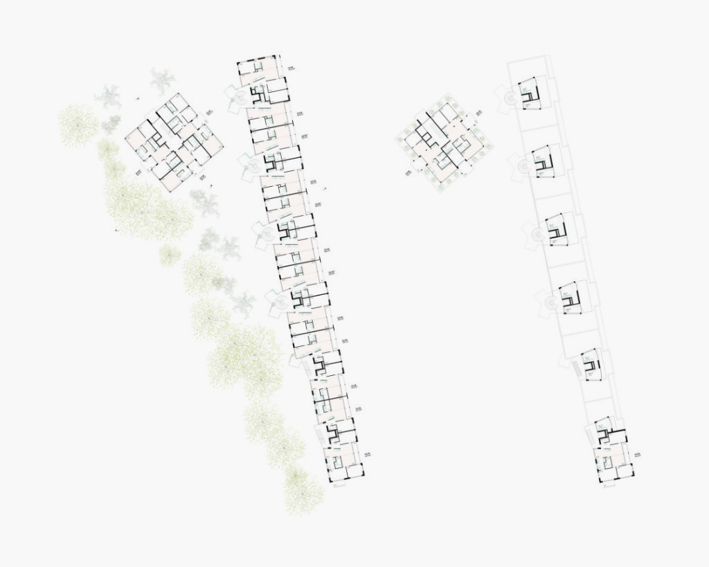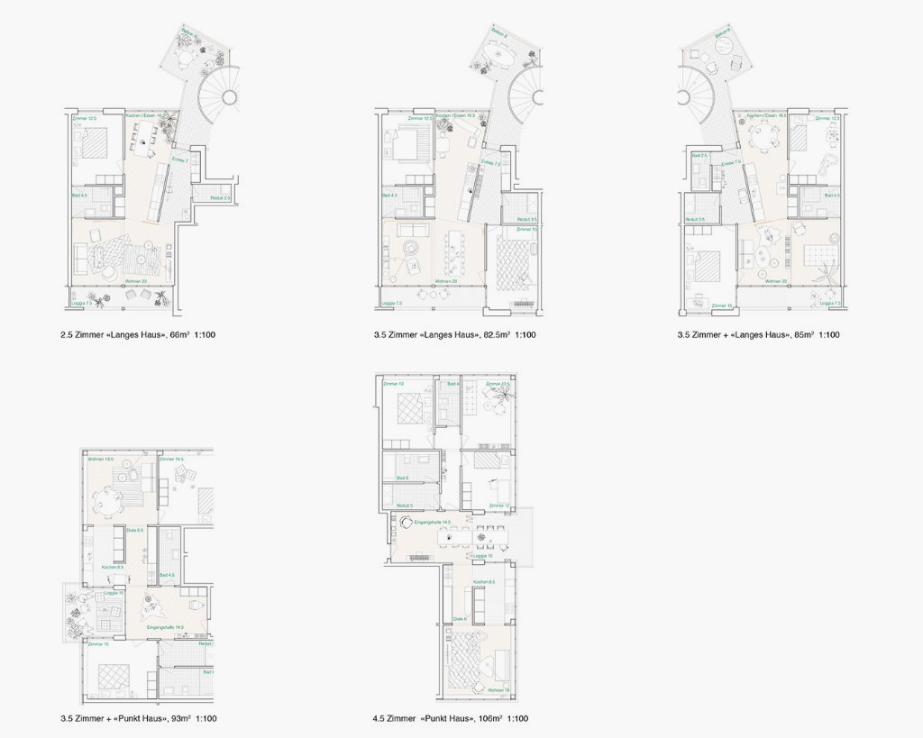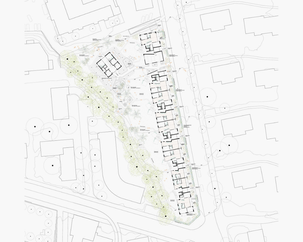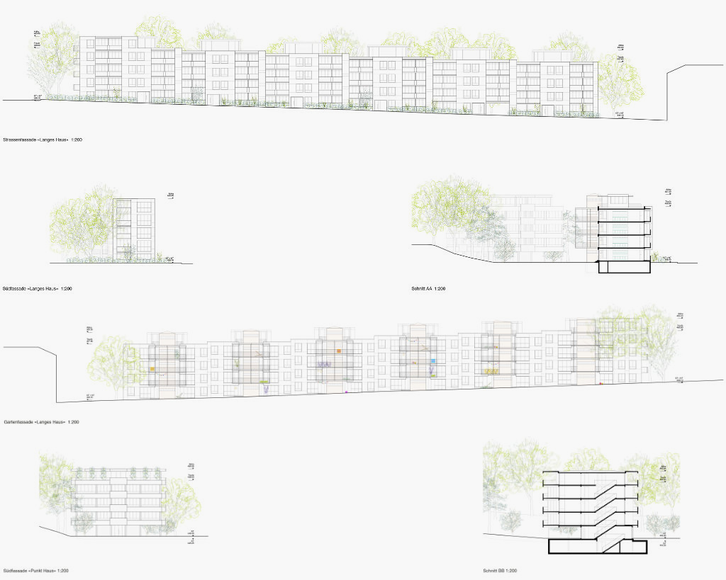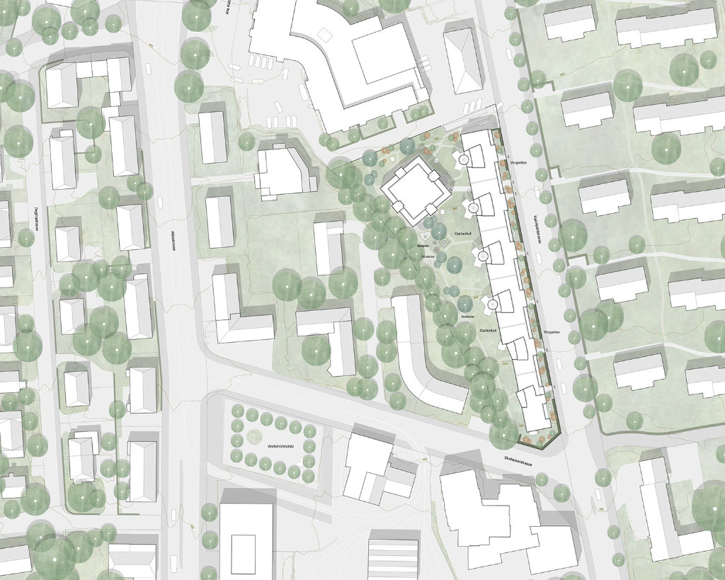 Die zwei Gebäude, das «Lange Haus» und das «Punkt Haus», schaffen ein Gefüge, das zusammen mit dem dritten wichtigen Element, dem «Gartenhof», zwischen dem städtischen Kontext und dem intimen Garten oszilliert. Strassenbegleitende Gebäude, innere zusammenhängende Gärten, Gebäude im Garten charakterisieren die Nachbarschaft und verankern die neue Genossenschaftssiedlung im Quartier. Trotz einer höheren Ausnutzung von 58 Wohnungen, fügt sich die neue Überbauung mit Dichte und ihren Proportionen ins Quartier ein.