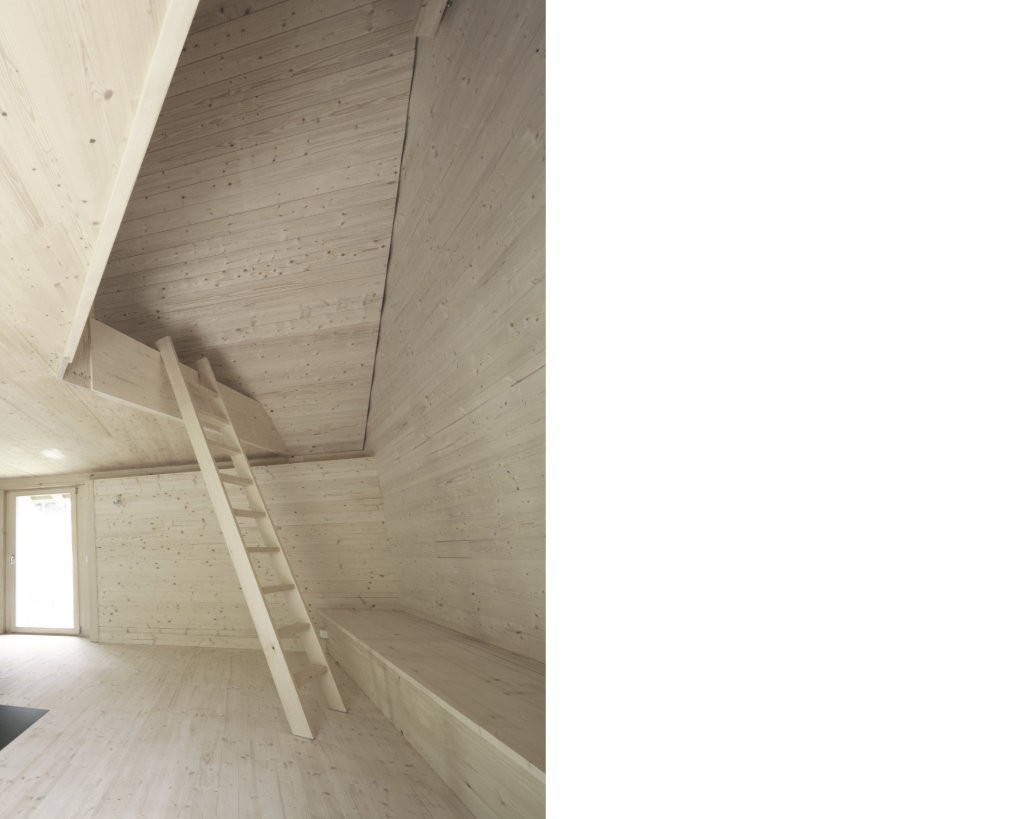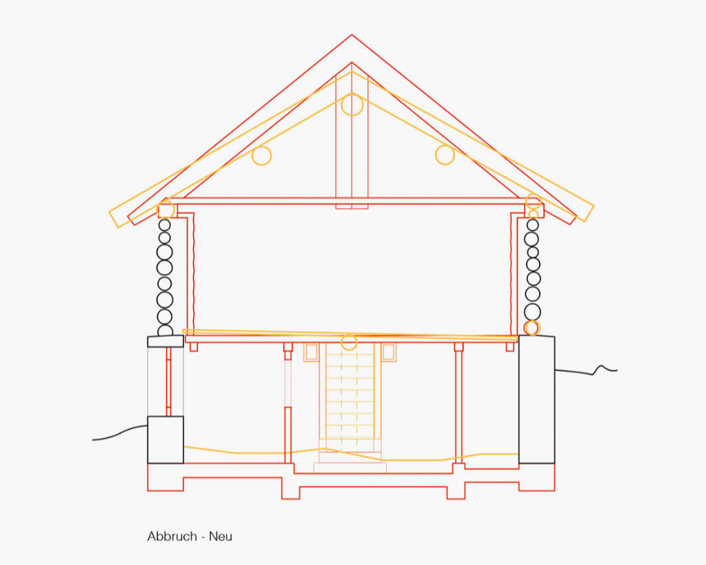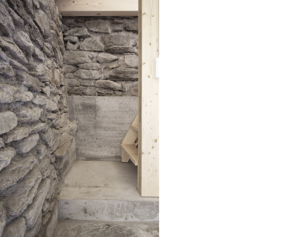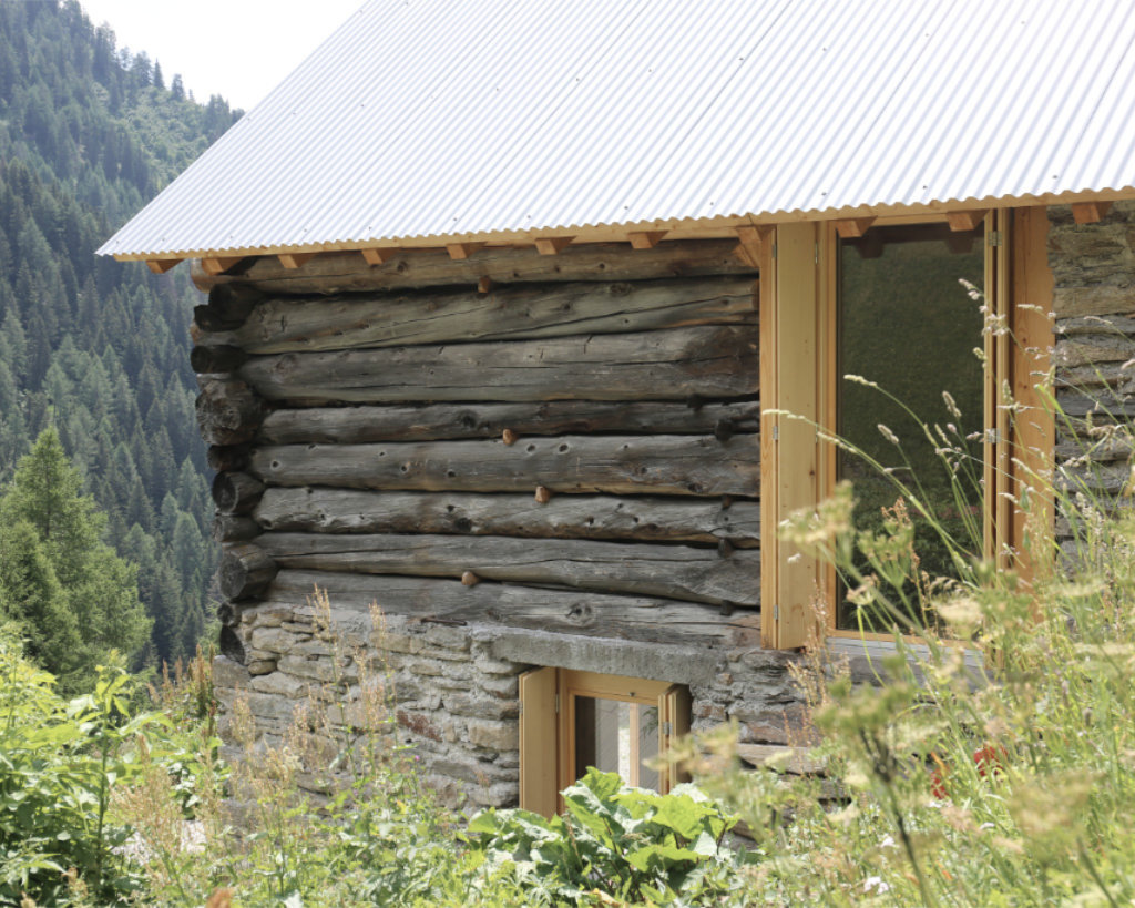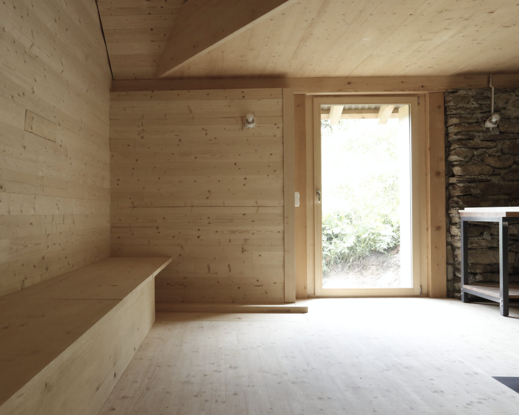 Eine Cascina (Stallscheune) wurde zu einem neuen, einfachen Lebensraum und individuellen Rückzugsort in den Alpen umgebaut. Die bauliche Substanz aus massiven Natursteinmauern im Sockelgeschoss und der aufliegende Holzstrickbau wurden umfassend baulich und konstruktiv ertüchtigt. Der Dachstuhl wurde nach historischem Vorbild neu aufgebaut, konstruiert als Capriata, aber als Neuinterpretation dieser historischen Konstruktion. Im Rahmen der kantonalen Gestaltungsvorgaben wurden nur die bestehenden Gebäudeöffnungen als Zugänge und Fenster umgebaut. Im ungeheizten Sockelgeschoss befinden sich die Nass- und Lagerräume. Innerhalb des bestehenden Strickbaus wurde eine neue innere Gebäudehülle aus fein profilierten, massiven Holzbalken eingebaut. Darin bildet ein zentraler Holzofen als Herd und Heizung das Zentrum des Wohnraumes. Im Dachstuhl bilden die quer gespannten Zuggurte der Capriata, ausgeführt in Brettsperrholz in Form einer Farfalla, die neue Schlafebene direkt über dem Holzofen. Das Gebäude konnte durch seine räumliche Logik und im Einklang mit dem alpinen Ort mit einer minimalen technischen Ausstattung konzipiert werden.