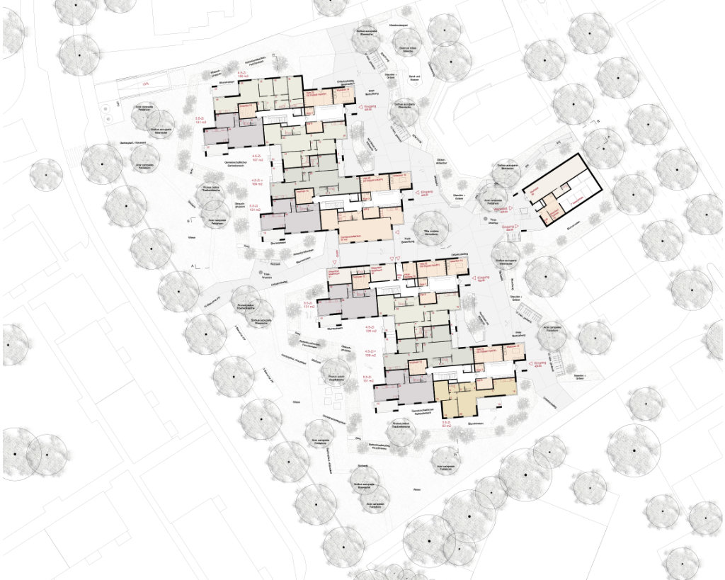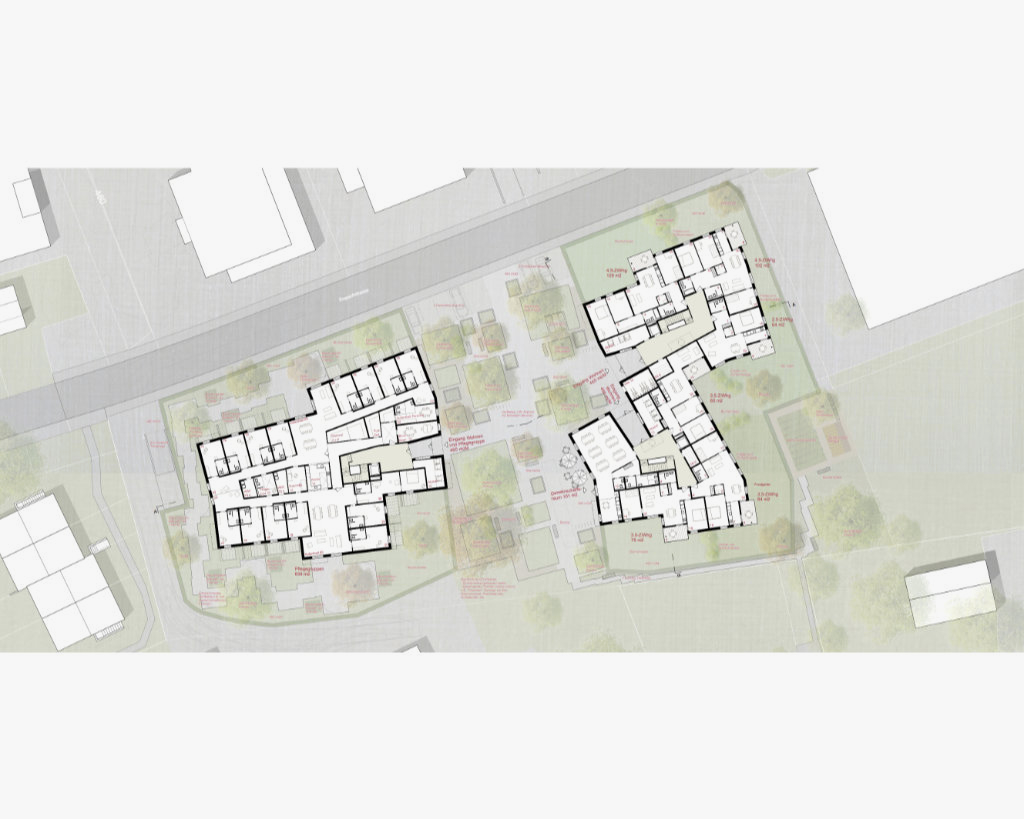 Die Wohn- und Siedlungsgenossenschaft Zürich (wsgz) beabsichtigt Ihr Areal in Mettmenstetten (ZH) in unmittelbarer Nähe zum Bahnhof mit altersgerechten Wohnungen, geeigneten Gemeinschaftsbereichen sowie zwei Pflegewohngruppen mit entsprechendem Aussenraum zu überbauen. Wir schlagen vor, die 50 altersgerechten Wohnungen und die Pflegegruppen in zwei Gebäuden zu organisieren. Die Volumen werden dabei möglichst weit an die östliche und westliche Parzellengrenze gesetzt. Die daraus entstehende Distanz der Baukörper ermöglicht eine grösstmögliche Privatheit der Wohnungen. Gleichzeitig schaffen wir damit einen großzügigen zentralen Garten, der als gemeinschaftlicher Erschliessungsraum, Aufenthaltsraum und sozialer Treffpunkt für die Siedlung dient und auch als Angebot an das Dorf verstanden wird. Durch seine Dimension und die vielfältige Bepflanzung garantiert er ein abwechslungsreiches, sinnliches Erlebnis für die Bewohner. Als Kontrast dazu werden die Gebäude jeweils dreiseitig von geschützten Gartenräumen eingefasst, was den Erdgeschosswohnungen und Pflegegruppen eine ungezwungene Privatheit ermöglicht. Die als Mehrspänner organisierten Gebäudegrundrisse ermöglichen unterschiedliche Orientierungen zur vielfältigen Umgebung. Alle Wohnungen bieten mindestens zwei Ausrichtungen an. Die in ihrer Grösse optimierten Erschliessungsbereiche schaffen pro Geschoss natürliche Begegnungsorte. Die gemeinschaftlichen Aufenthaltsflächen in den Gebäuden konzentrieren sich auf die Waschsalons in den Attikageschossen. Durch deren Außenraum und Sitzgelegenheiten laden sie als informelle Treffpunkte ein. Der Gemeinschaftsraum im Erdgeschoss ist auf den zentralen Garten orientiert und so auch von Aussenstehenden nutzbar.