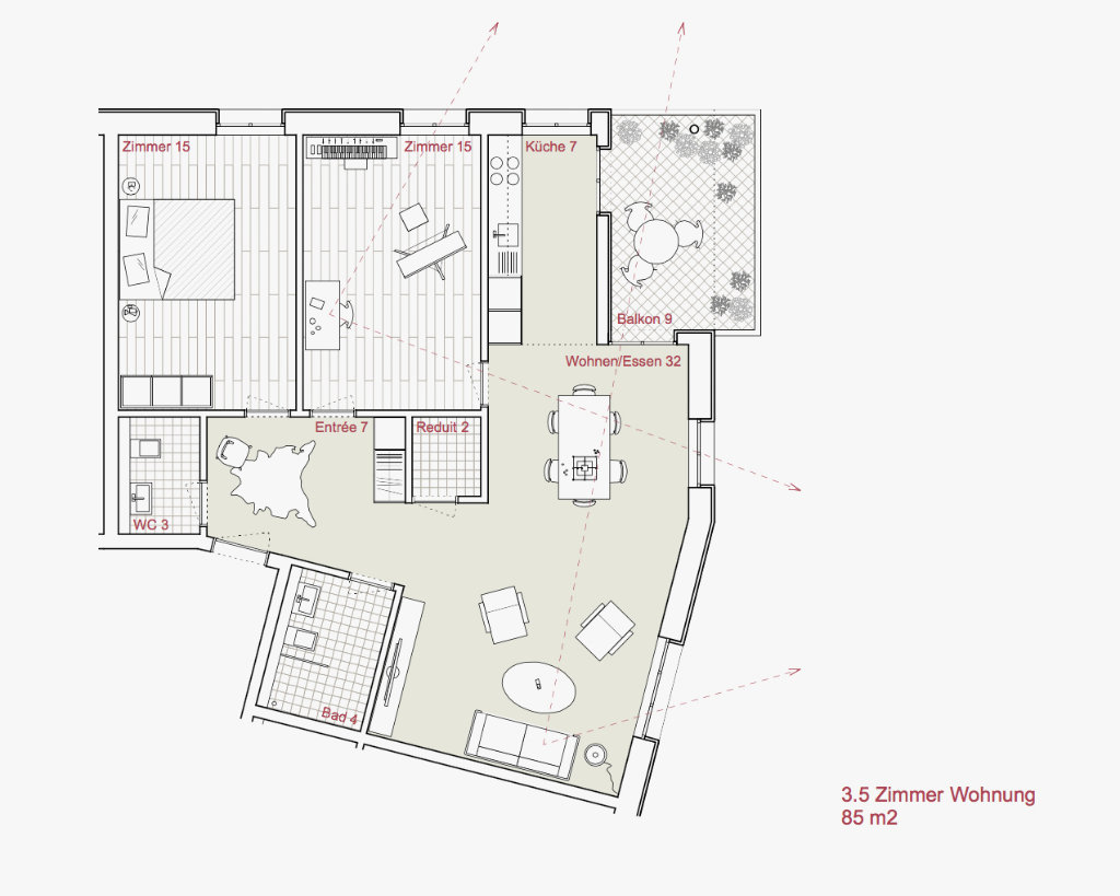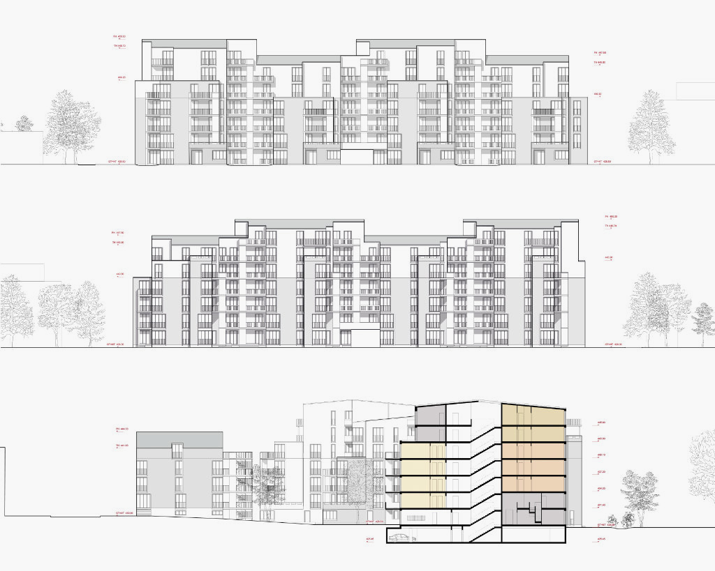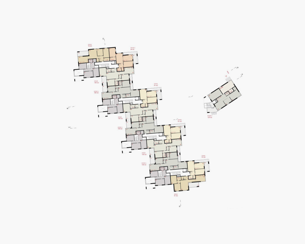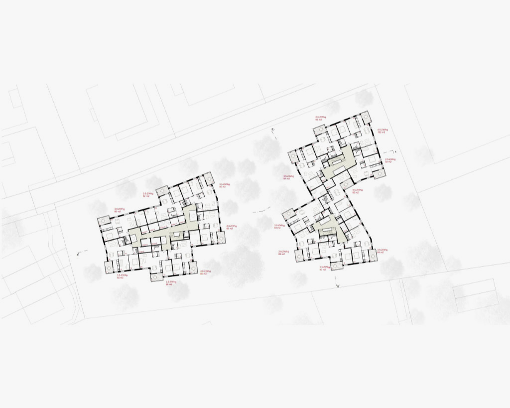 Das durchgrünte Wohnquartier Wollishofen ist charakterisiert von einer lockeren, offenen Bebauung mit frei stehenden Häuserzeilen. Der Perimeter liegt zwischen Tannenrauch- und Mutschellenstrasse, wo sich grössere Solitärbauten finden, welche von urbanen Aussenräumen und Gartenanlagen umgeben sind. Die bestehenden Wohnhäuser aus den 50er–Jahren zwischen der Tannenrauchstrasse und der Mutschellenstrasse entsprechen nicht mehr den heutigen Wohnbedürfnissen. Ziel der Wohn- und Siedlungsgenossenschaft Zürich (wsgz) sind ungefähr 100 qualitativ hochstehende, mehrheitlich Familienwohnungen in einem mittleren Preissegment mit geeigneten Begegnungszonen und Gemeinschaftsbereichen. Wir schlagen eine Konzentration der neuen Baumasse im östlichen Teil des Areals vor. Der grosse Neubau reiht sich selbstverständlich in die Gruppe der grösseren Einzelbauten entlang der Tannenrauchstrasse ein, die ebenfalls merklich von der Strasse zurückversetzt sind. Diese Positionierung schafft einen grosszügigen und nutzbaren, parkartigen Freiraum und erlaubt die Umsetzung eines Gebäudes mit einer starken Identität und Ausstrahlung ohne den Strassenraum nachhaltig zu verändern, sondern vielmehr in seinem Bestand aufzuwerten. Die Einbindung in den Kontext erfolgt über die Aufnahme der klaren Struktur der Grünräume und der Körnung der angrenzenden Bauten. Durch den neuen parkartigen Freiraum wird ein zusammenhängender, grosszügiger Grünraum entlang der Tannenrauchstrasse aufgespannt und stellt die Verbindung mit dem durchgrünten Quartier her. Mit der Staffelung des Gebäudevolumens werden eine Differenzierung des Baukörpers und eine masstäbliche Verbindung an die Körnung und die Traufhöhen der umgebenden Bebauungsstruktur erreicht. Das nach innen orientierte Begegnungsband ist der Kumulationspunkt und die zentrale Erschliessung aller Nutzungen der Genossenschaft. Die Konzentration der gemeinschaftlich genutzten Räumlichkeiten und der Hauszugänge begünstigt die Interaktion der Bewohner und fördert eine genossenschaftliche Gemeinschaft und Zugehörigkeit. Die Lage des Begegnungsbandes an der Strassen abgewandten Seite, schafft einen klar gefassten, gemeinschaftlichen Aussenraum, der die Identität der neuen Siedlung definiert und sie zur Einheit zusammenbindet. Der zentrale gedeckte Durchgang dient als multifunktionaler, gedeckter Aussenbereich. Die Hauptstruktur des grossen Neubaus besteht aus vier zueinander versetzten Vierspännern. Diese setzen sich jeweils aus zwei durchgesteckten Wohnungen und zwei Eckwohnungen zusammen. Eine Entwicklung in der Höhe und eine Ost-West Orientierung des Gebäudes generieren eine angemessene Vielfalt und eine Vielzahl an unterschiedlichen Wohnungen für alle Altersklassen und Lebenssituationen. Alle 92 Wohnungen besitzen mehrheitlich drei, mindestens aber zwei Ausrichtungen.