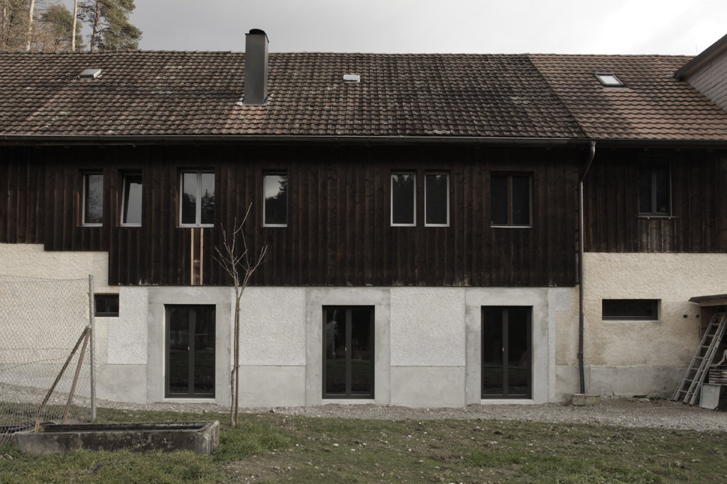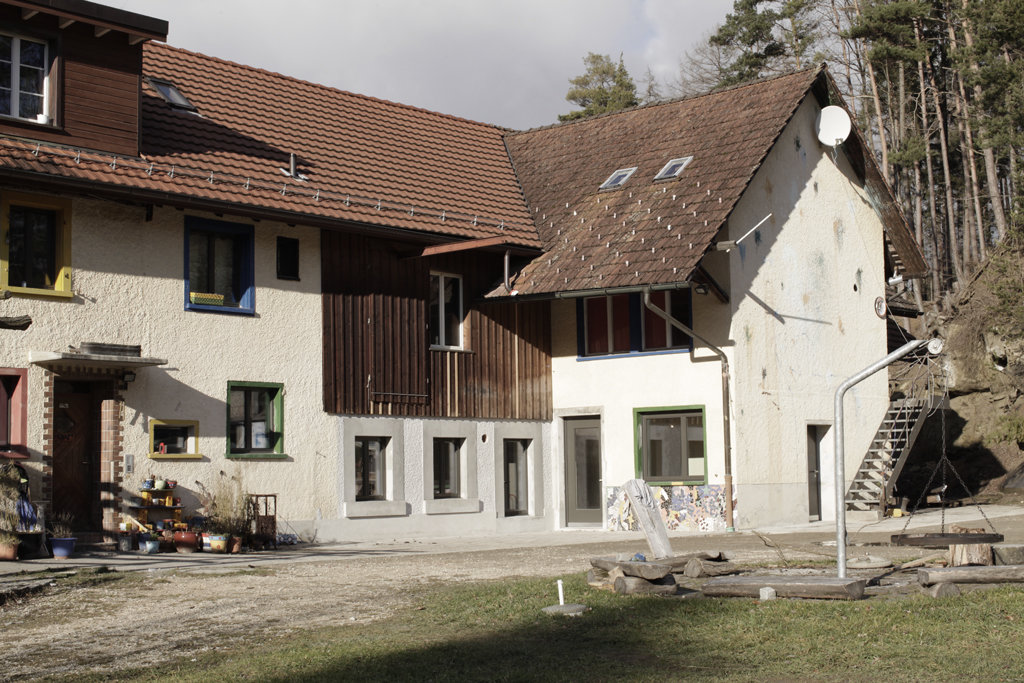 Der Hof Grienen in der Nähe von Winterthur Seen bietet diverse alternative Wohnformen. Als ehemaliger Bauernhof steht er auf der Anhöhe eines zwei Hektar grossen Grundstückes und bietet mit einer Groß-WG Wohn- und Lebensraum für rund 20 Personen - im Haus, in umgebauten Bauwagen oder mongolischen Jurten. In enger Zusammenarbeit mit der Bauherrschaft wurde ein Projekt entwickelt, bei dem mehr Wohnraum für Familien und eine bessere sanitäre Infrastruktur für WagenbewohnerInnen geboten werden. Der ehemalige Stall wurde zu einer Vierzimmer-Familienwohnung umgebaut und eine kompakte Nasszelle geschaffen, die den Wagen- und JurtenbewohnerInnen eine neue sanitäre Infrastruktur bietet. Die Konstruktion der Wohnung im Erdgeschoss wurde akustisch entkoppelt vom Konzertraum im Obergeschoss. Das Projekt wurde mit einem hohen Grad an Eigenleistung der BewohnerInnen umgesetzt. Dementsprechend ist die Konstruktion einfach konzipiert und unterstützt durch seine Gestaltung und den Einsatz von einfachen, aber wertigen Materialien die collageartige Erscheinung des gesamten Hof-Ensembles.