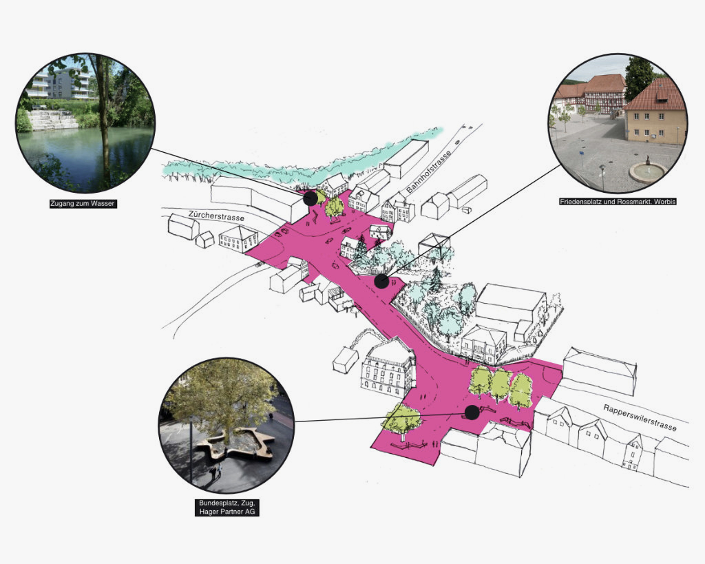„In Wetzikon fehlt eine übergeordnete städtebauliche Vision, die eine aktivere und stringentere Planung erlauben würde.“ (Zitat Stakeholder) Die Studie Fokus 1 legt die Basis für weitere Fokus Studien. Ziel ist eine dynamische Planungsstruktur, die kurz- und langfristig greift. Im Rahmen der Studie Fokus 1 hat ein multidisziplinäres Team unter der Federführung von BASK in enger Zusammenarbeit mit der Stadtplanung Wetzikon und einer Kommunikationsagentur eine übergeordnete Vision für den Stadtraum Unterwetzikon entwickelt, die auf den vorhandenen Planungen und dem REK aufbaut. Es wurden neue zusammenhängende Verkehrs-, Freiraum-, Städtebau- und Beleuchtungskonzepte erarbeitet und Detailräume vertiefter und exemplarisch als Richtprojekte entworfen. Dabei spielte die Einbettung in ein übergeordnetes Kulturlandschaftskonzept eine wichtige Rolle. Im Verlauf dieses Prozesses wurden u.a. Schatzkarten für das Gebiet Unterwetzikon entwickelt und damit eine partizipative Planungskultur angestossen, welche die Stakeholder und ihre Anliegen einbezieht. Basierend auf der übergeordneten Vision und dem Verkehrs-, Freiraum-, Städtebau- und Beleuchtungskonzept wurde ein Katalog erarbeitet, der konkrete Sofortmassnahmen für die kurz-, mittel- und langfristige Umsetzung zur Verfügung stellt. Die Resultate der Studie Fokus 1 werden in den weiteren Fokus Studien miteinbezogen und weiterentwickelt, so dass die Basis für eine flexibele, wirksame und vernetzte Planung entsteht, die in der Bevölkerung verankert ist und von ihr mitgetragen wird. Der Stadtrat Wetzikon hat die Massnahmen gesichtet, bewertet und die Realisierungsmöglichkeiten und die Umsetzung priorisiert.