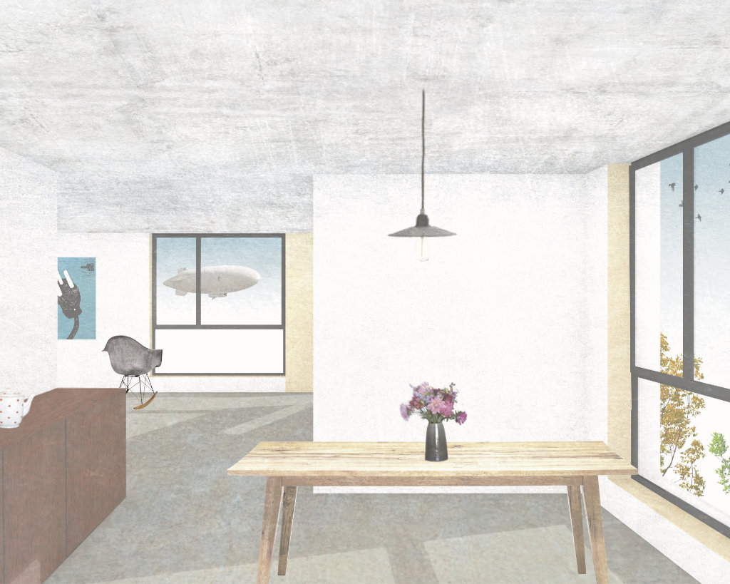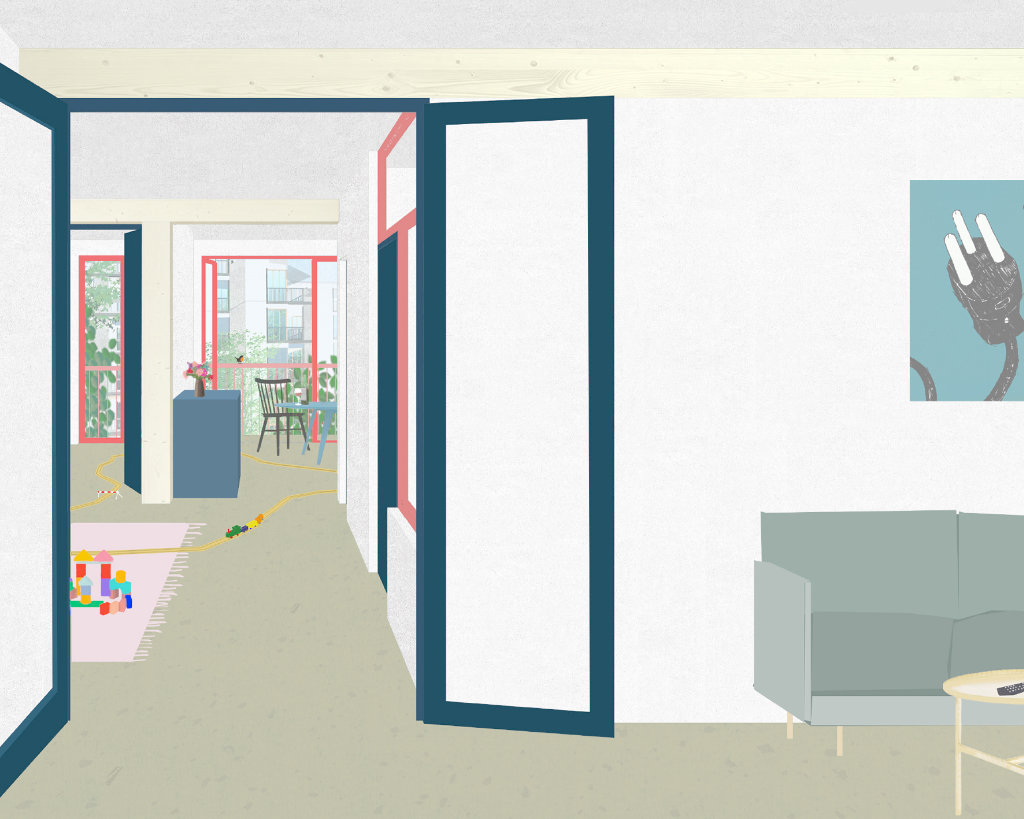 Die Ausrichtung der drei Ersatzneubauten im Quartierzentrum folgt der Logik des gesamten Quartiers. Die drei Ersatzneubauten sind alle als allseitig ausgerichtete Punkthäuser konzipiert, auch im Erdgeschoss. Durch die vierseitige Orientierung wird ein Bezug des Quartierzentrums zur Umgebung gestärkt. Durch die grosse Gebäudetiefe entstehen gleichzeitig zum Platz und zum Grünraum belebte Frontfassaden. Dies ermöglicht im Erdgeschoss eine sinnvolle Mischung von öffentlichen bzw. publikumsorientierten Nutzungen und Wohnungen zu planen. In den oberen Geschossen belebt die Ausrichtung von Wohnräumen zum Platz diesen zusätzlich. Über eine einzige vertikale Erschliessung gelangt man in die oberen Stockwerke. Die „Wohnwelt“ eröffnet sich mit einem grosszügigen, natürlich belichteten Treppenhaus ab dem 1. Obergeschoss.