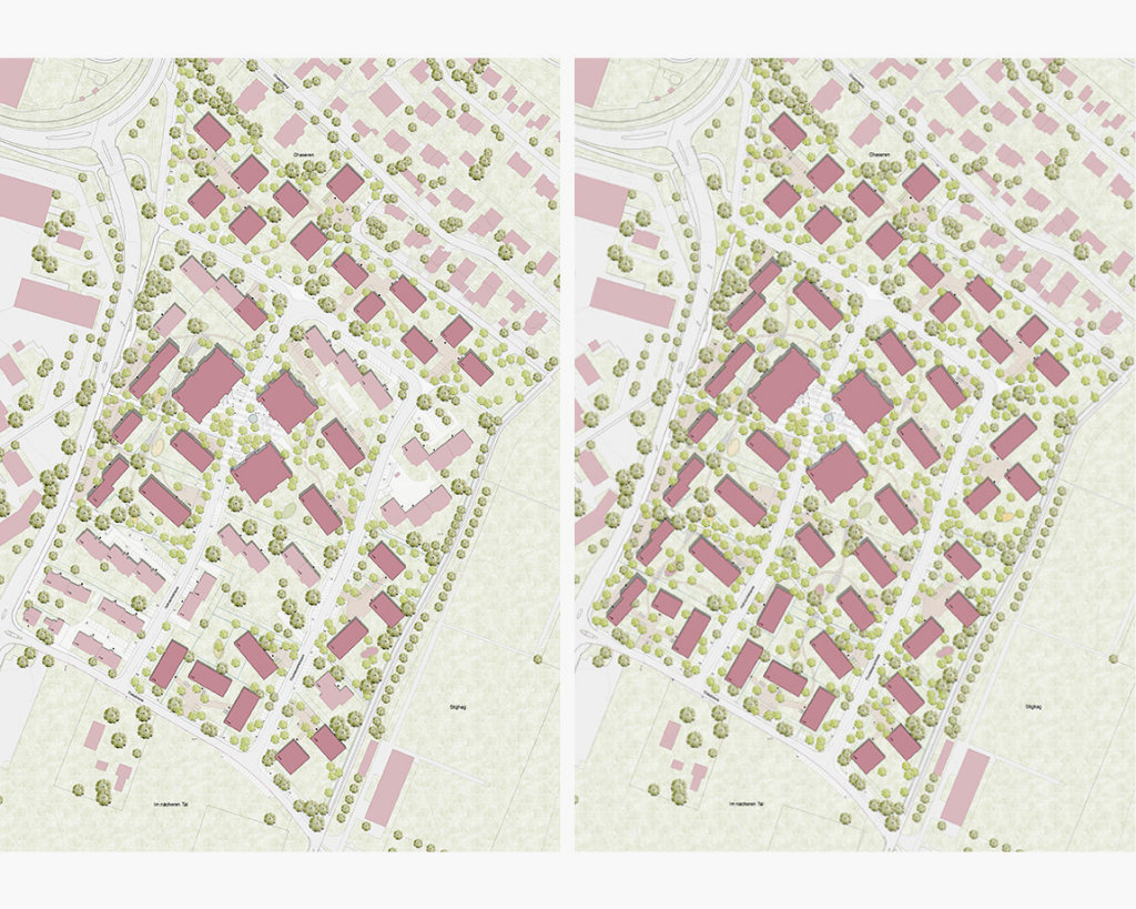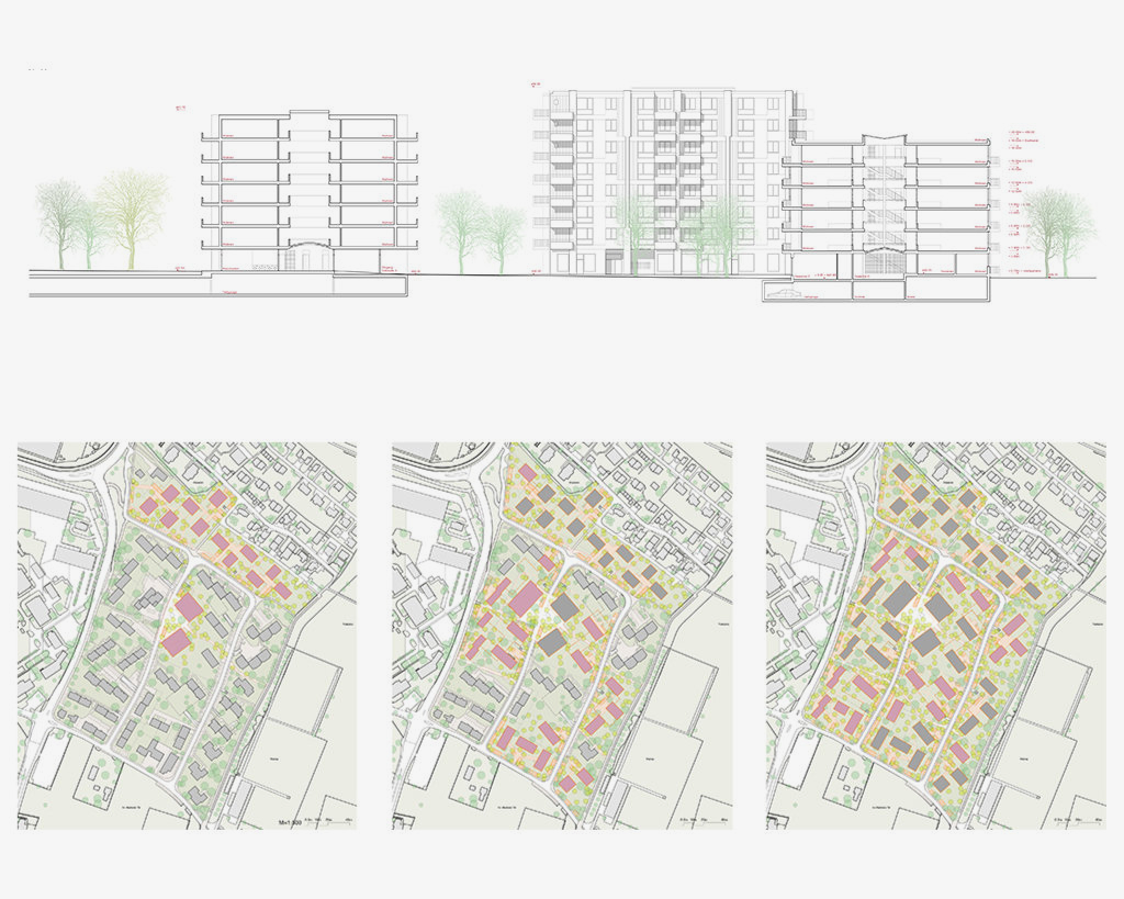 Auf Basis der städtebaulichen Entwicklungsstrategie für das gesamte Quartier Malerva Nord haben wir für die erste Etappe eine Überbauungsstudie als Richtprojekt für einen Überbauungsplan erarbeitet. Eine hohe Diversität in der Sozialstruktur soll durch einen breiten Mix an Gebäudetypen erreicht werden und gleichzeitig eine starke Identifizierung der Bewohner mit der Nachbarschaft durch hohe architektonische wie freiräumliche Qualitäten. Ein Grundgerüst in Form einer robusten identitätsstiftenden, städtebaulichen und freiräumlichen Grundstruktur schafft den Rahmen für eine langfristig dynamische und sozial gemischte Nachbarschaft. Die Freiraumstruktur der ersten Etappe bietet mit Gassen, Plätzen, Gärten und Park abwechslungsreiche und unterschiedliche Aussenräume, die sowohl in der ersten Etappe funktionieren und später auch Funktionen des Quartierzentrums für das gesamte Malerva Nord und seine nahe Umgebung übernehmen können. Die Etappe 1 bietet einen breiten Mix an Wohnungen mit verschiedenen Aussenräumen: Balkon/Loggia, privater/gemeinschaftlicher Garten oder Dachterrasse. In der Gestaltung der Erdgeschossräume wird auf eine flexible Nutzungsmöglichkeit Wohnen/Arbeiten geachtet und somit eine mögliche leichte Erhöhung des Gewerbeanteils bei der Erstellung weiterer Etappen eingeplant. Es gibt Möglichkeiten zur Kombination von Wohnen+Arbeiten einerseits in Atelier-Reihenhäusern, andererseits durch kleinere Gewerberäume entlang der Gassen - zur Miete oder als Eigentum.